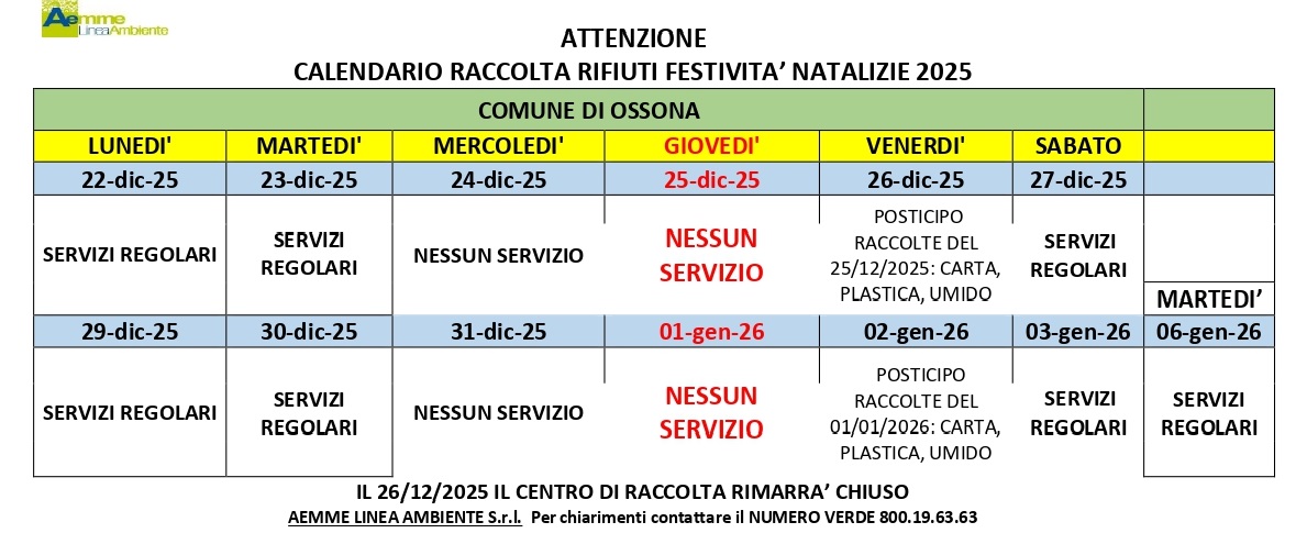 In allegato il calendario dettagliato raccolta rifiuti delle ferività natalizie 2025